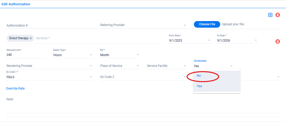 If you cannot delete the authorization or payer, it is recommended to change the authorization to unschedulable. Within the authorization, go to the "schedulable" dropdown for each service and select "no"