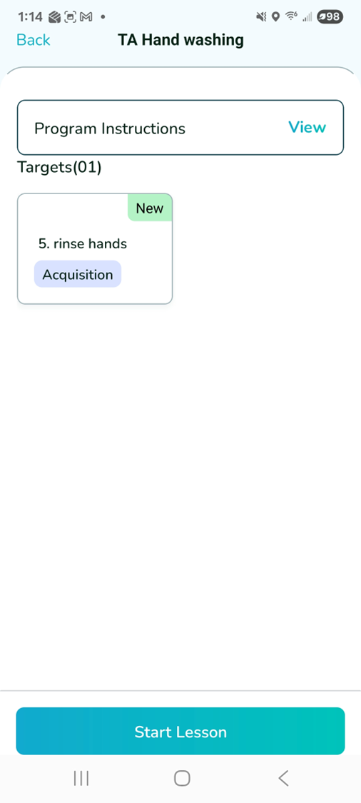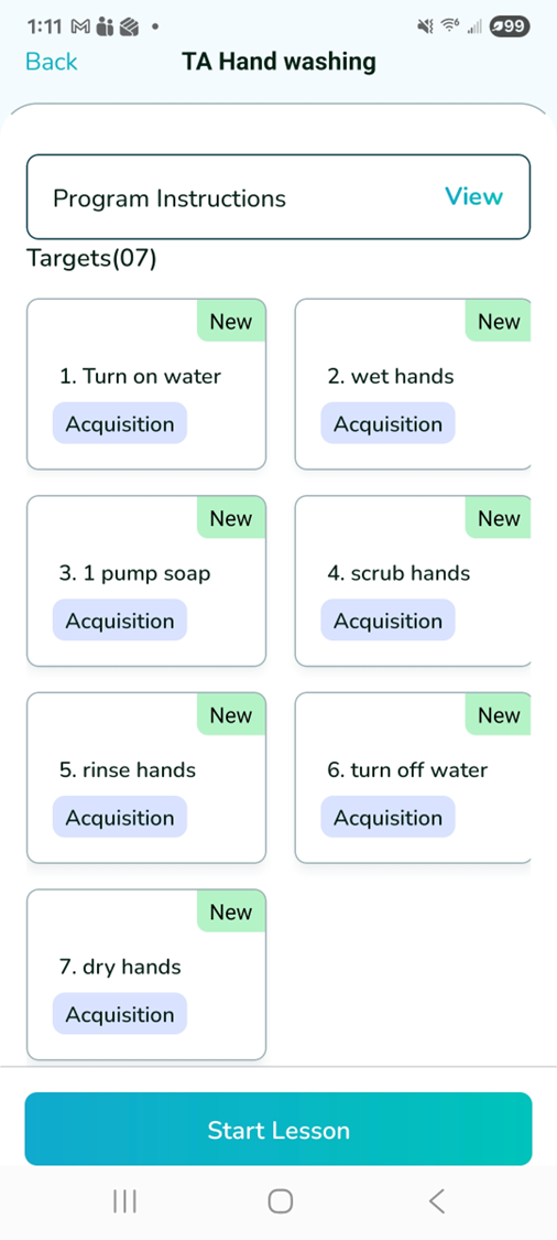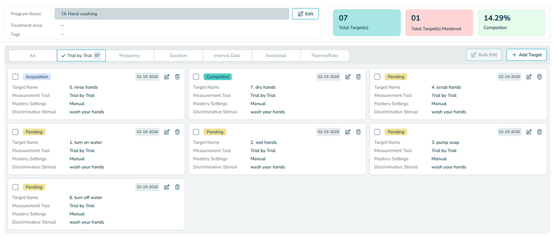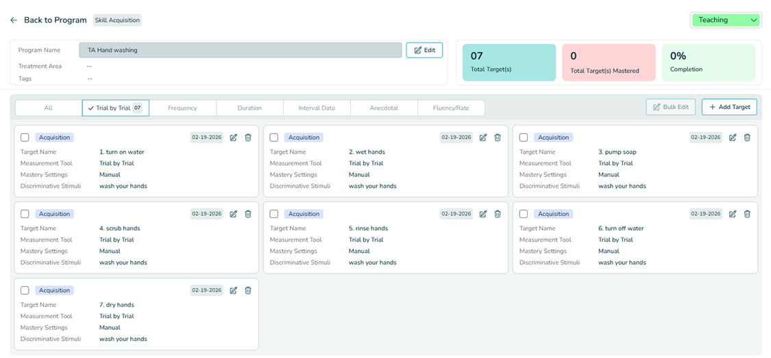 Trial-by-Trial target (e.g. 1. Turn on water; 2. Wet hands). Select the desired