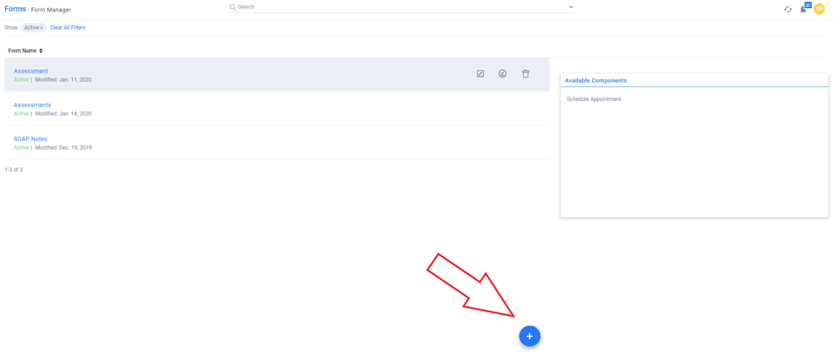 In Form Manager you will see a list of forms that you or your organization has created. Click the + icon at the bottom right corner to create a form.