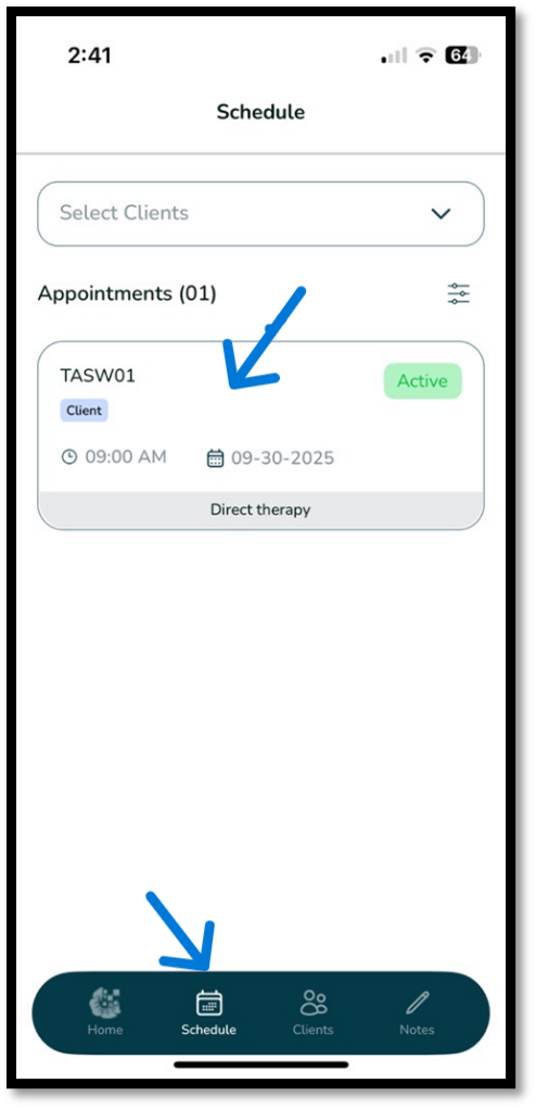 To view your scheduled sessions for the day, you can either tap the light blue box titled “Sessions” on your home screen, or tap the Calendar icon in the dark blue navigation bar at the bottom of your home screen. Tapping either will take you to a new “Schedule” page displaying your appointments for the current day.