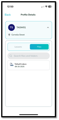 Viewing the program information will NOT start the session! The only way to start a session is to tap the “Start Lesson” button at the bottom of the screen. Do not tap “Start Lesson” until you are ready to start your session!!Navigate to the client’s page and tap the “Files” tab.