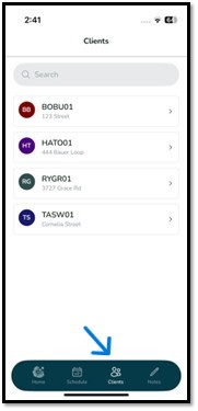To view the clients on your caseload, you can either tap the light blue box titled “Clients” on your home screen, or tap the People icon in the dark blue navigation bar at the bottom of your home screen. Tapping either will take you to a new “Clients” page displaying the clients on your caseload.