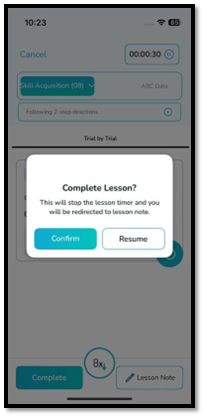 Tap this button at start the session at the session’s scheduled start time – this time will synch to your Session Note. You do not need to immediately begin collecting upon tapping the Start Lesson button. At the end of your scheduled session, tap the “Complete” button at the bottom left of the screen. This will give you a pop-up window asking you to confirm if you are ready to complete the session (if you have tapped the button in error, you can tap “Resume”) Tap "confirm" to end the session. This timestamp at the end of your session will sync to your session note.