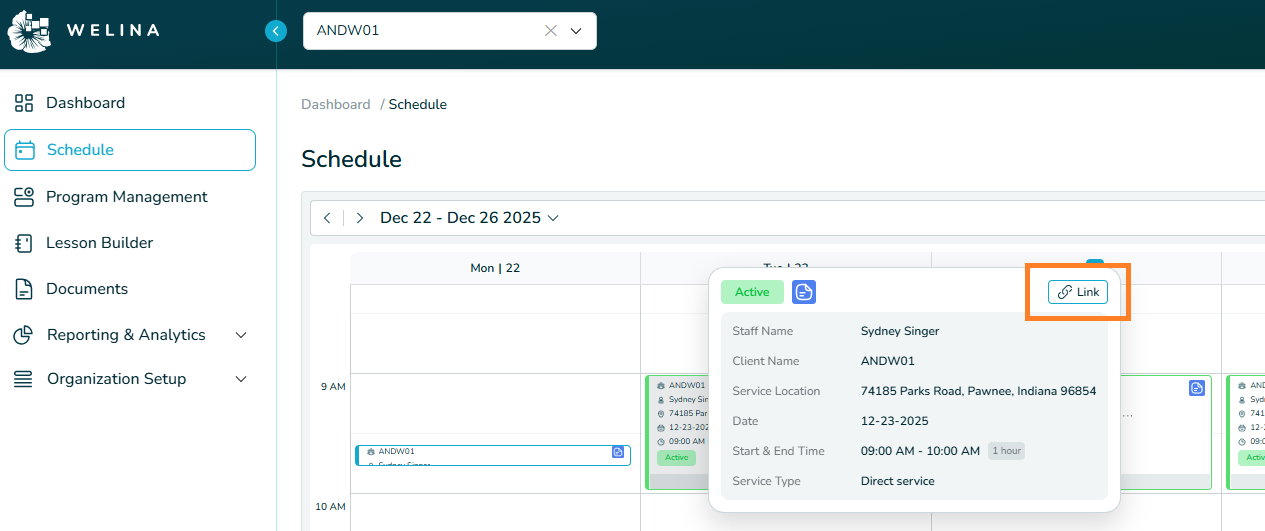 2. In Welina: Navigate to view Schedule using the left-hand menu.