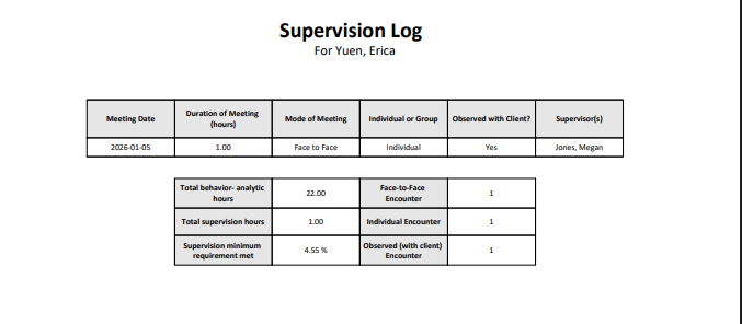 Aloha does not provide the official tracker required for BCBA supervision. Graduate students are responsible for maintaining and submitting their own supervision hour trackers in accordance with their program and BACB requirements. However, the data available in the Staff Supervision Log can be reviewed and used to support accurate reporting, and may be transferred into individual supervision trackers to assist with graduate school documentation.