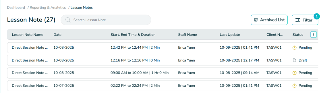 serves as a “soft delete.” When a note has been archived, the note will no longer appear in the main Lesson Note list, will not link to any other integrated
